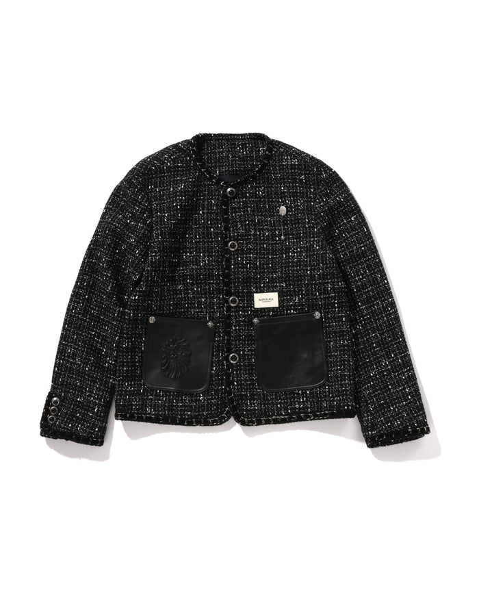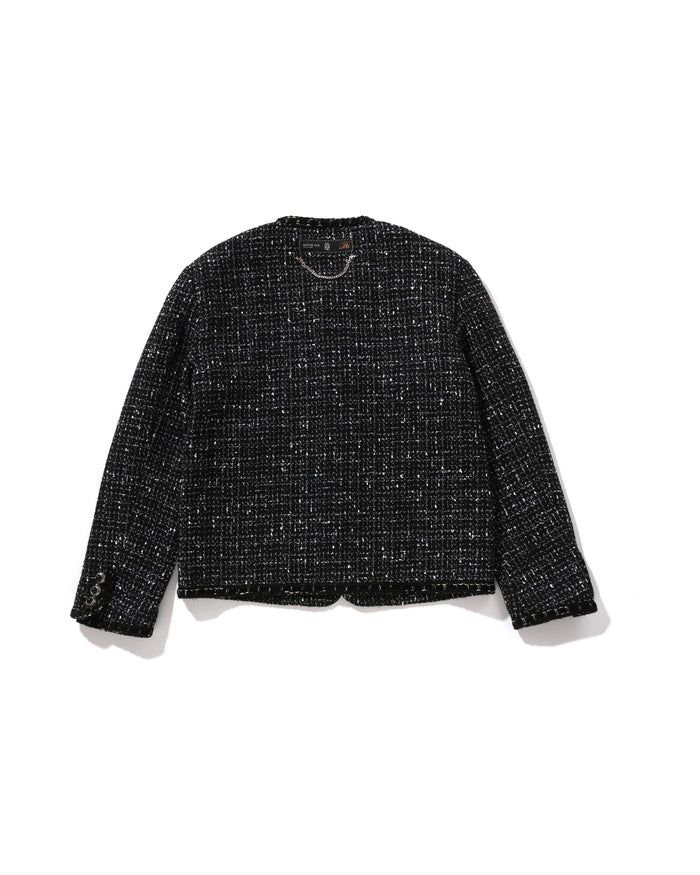 Collarless Ornament Tweed Coat